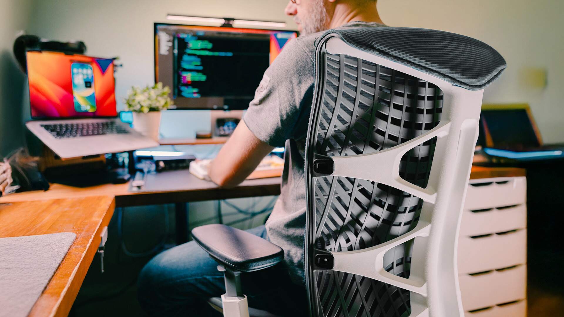 The backrest has flexible ribs built into the frame instead of a rigid panel. When you shift forward to type or lean back to think, the ribs flex with you and keep the surface aligned with your spine's curve throughout the movement. You stop fighting the chair and it just follows you.