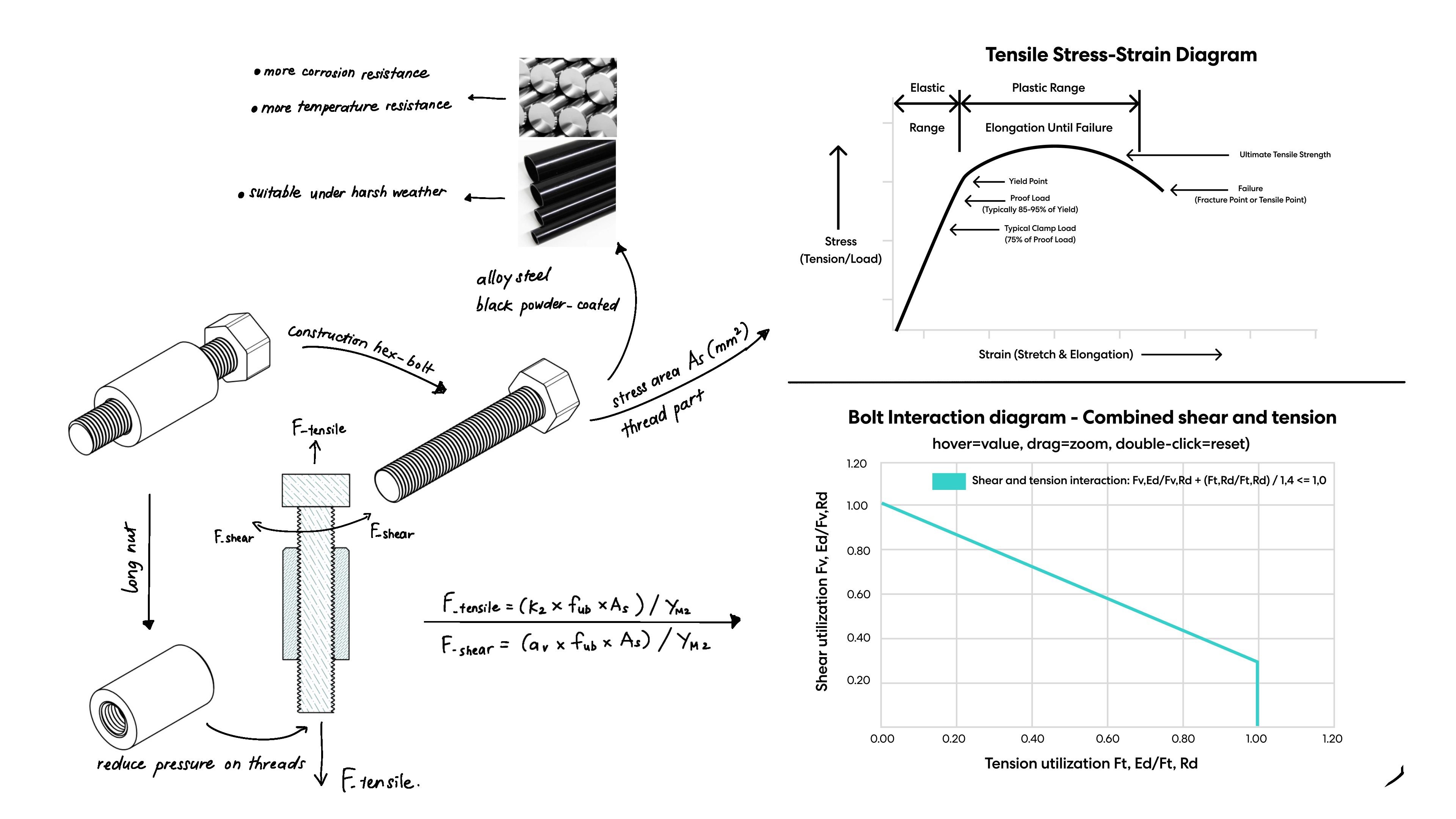 The tensile stress-strain diagram in Figure 1 shows the relationship between stress (tension/load) and strain (stretch/elongation) for the material. It illustrates the elastic and plastic ranges, yield point, and ultimate tensile strength, providing insight into the material's performance under various loads. The bolt interaction diagram shows the combined shear and tension interaction for the bolt, ensuring it operates within safe limits (Kim & Lee, 2016).