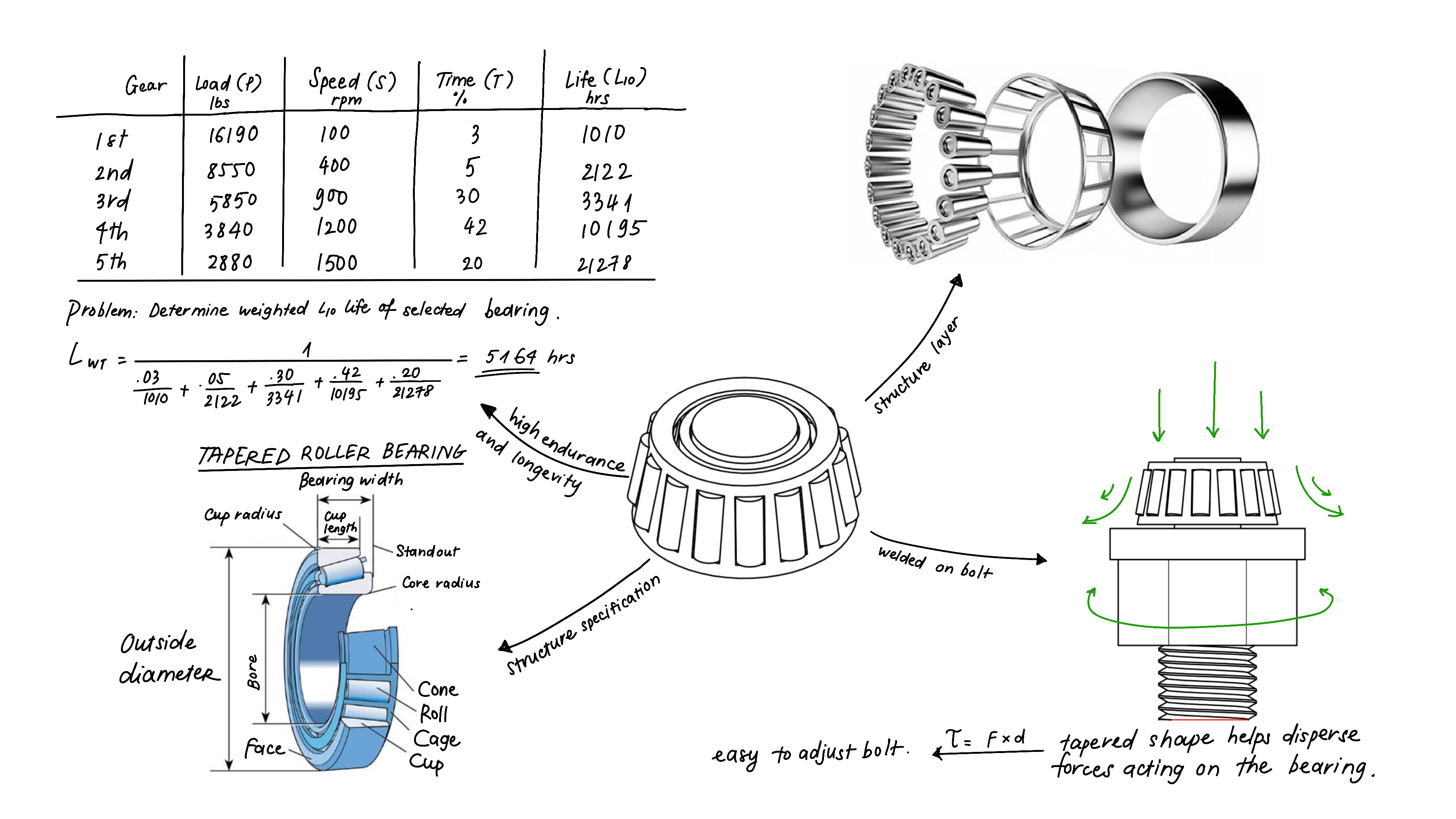| Gear | Load (P) lbs | Speed (S) rpm | Time (T) % | Life (L10) hrs |