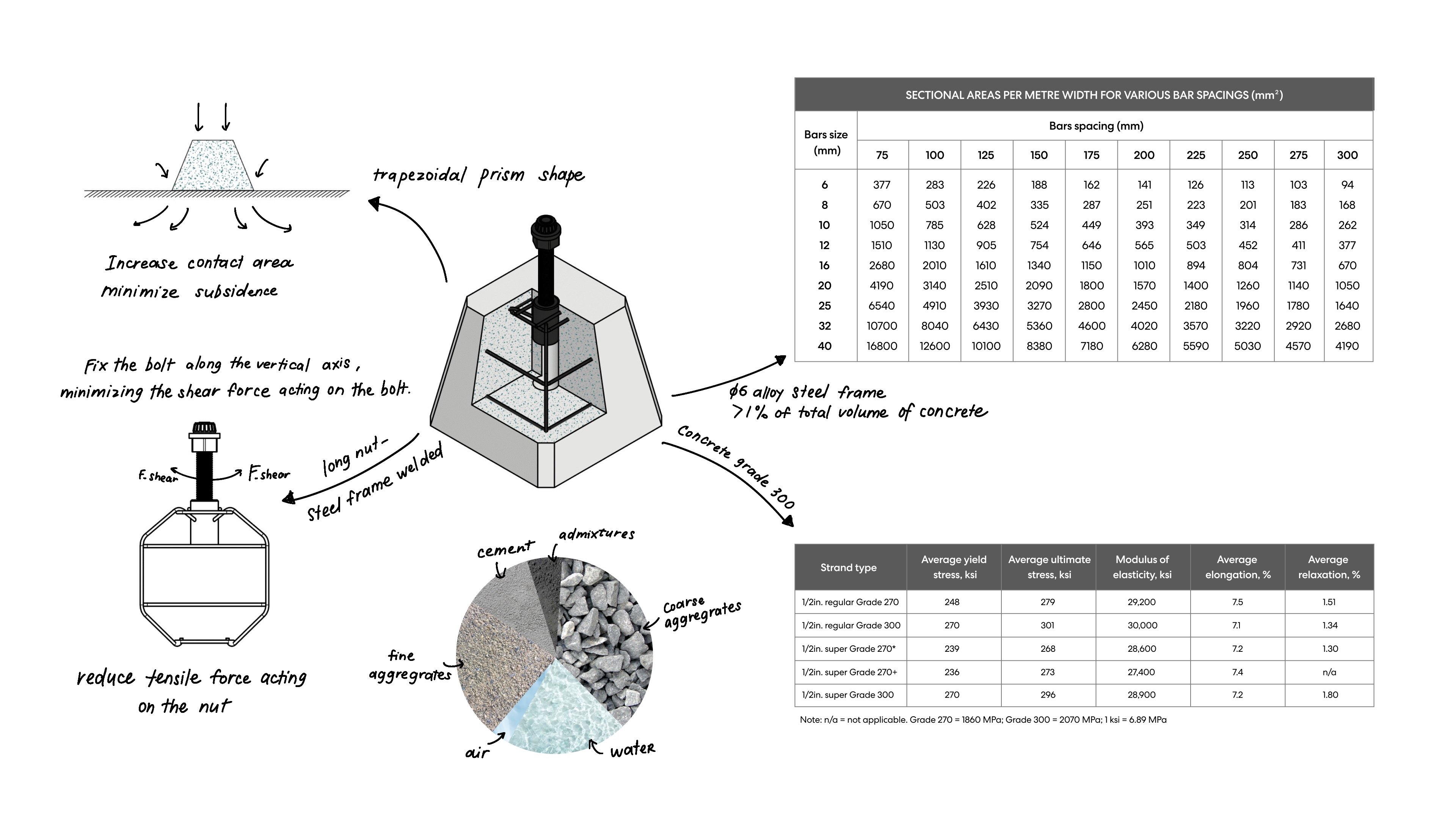 The use of reinforcement bars with appropriate spacing ensures that the concrete base can handle the tensile stresses imposed by the loads. The correct sectional area of rebar per meter width helps in distributing the stresses evenly and prevents the concrete from cracking under load (Martinez & Gomez, 2017). This reinforces the overall stability and durability of the Pod foundation.