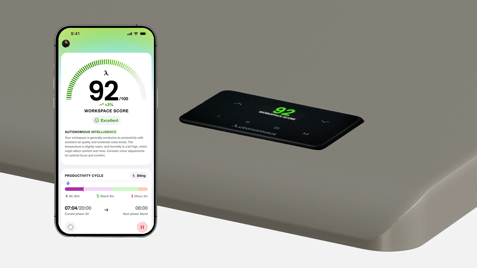 Autonomous Desk AI uses built-in sensors to read your workspace environment and your movement, giving you one clear Workspace Score that reflects your daily balance, focus, and energy.